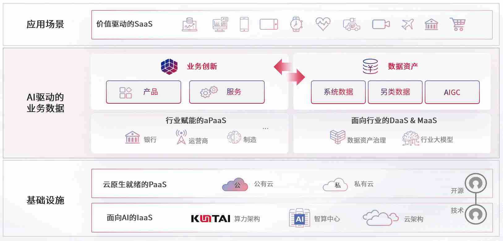 数字时代,,,围绕企业数字化转型的关键要素,,,,z6com尊龙凯时数码开创性的提出数云融合战略和技术体系框架,,着力在云原生、、、、数字原生、、、、AI原生和信创产业上架构产品和服务能力,,,,为处在不同数字化转型阶段的快消零售、、汽车、、金融、、、、医疗、、、政企、、教育、、运营商等行业客户提供泛在的敏捷IT能力和融合的数据驱动能力,,,,构建跨界融合创新的数字业务场景和新业务模式,,助力企业级客户建立面向未来的核心能力和竞争优势,,,全面推动社会的数字化、、、、智能化转型升级。。。。