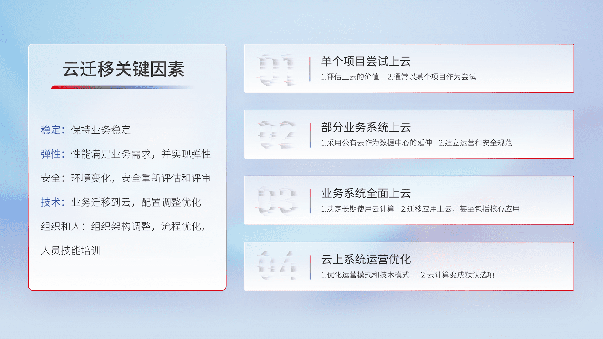 结合实际业务,,,从规划设计、、云平台选型、、云原生改造、、数据迁移、、、集成交付,,,迁移全过程为客户识别最佳上云路径,,,,做好风险识别管理,,,,设计网络架构、、、、身份权限、、、、安全审计合规、、、操作审计、、、、日志审计、、、、监控告警策略、、多站点容灾设计等,,对云上基础设施进行整体规划,,提升IT治理水平,,,以满足弹性、、、高可用、、高性能的需求。。